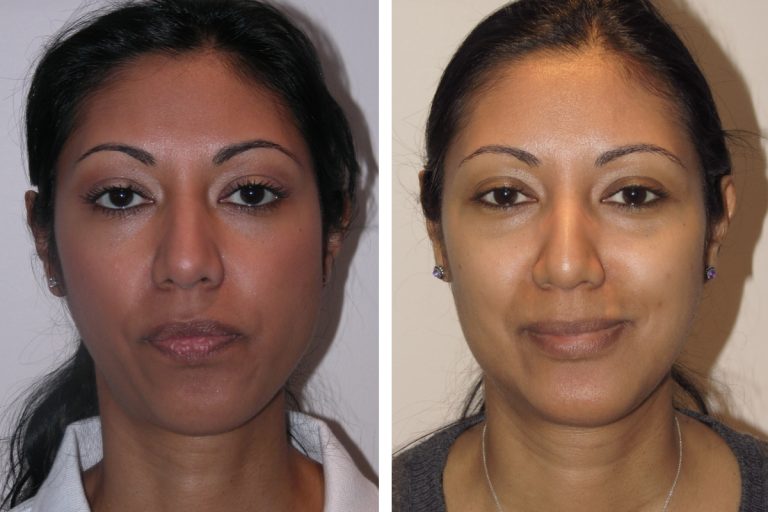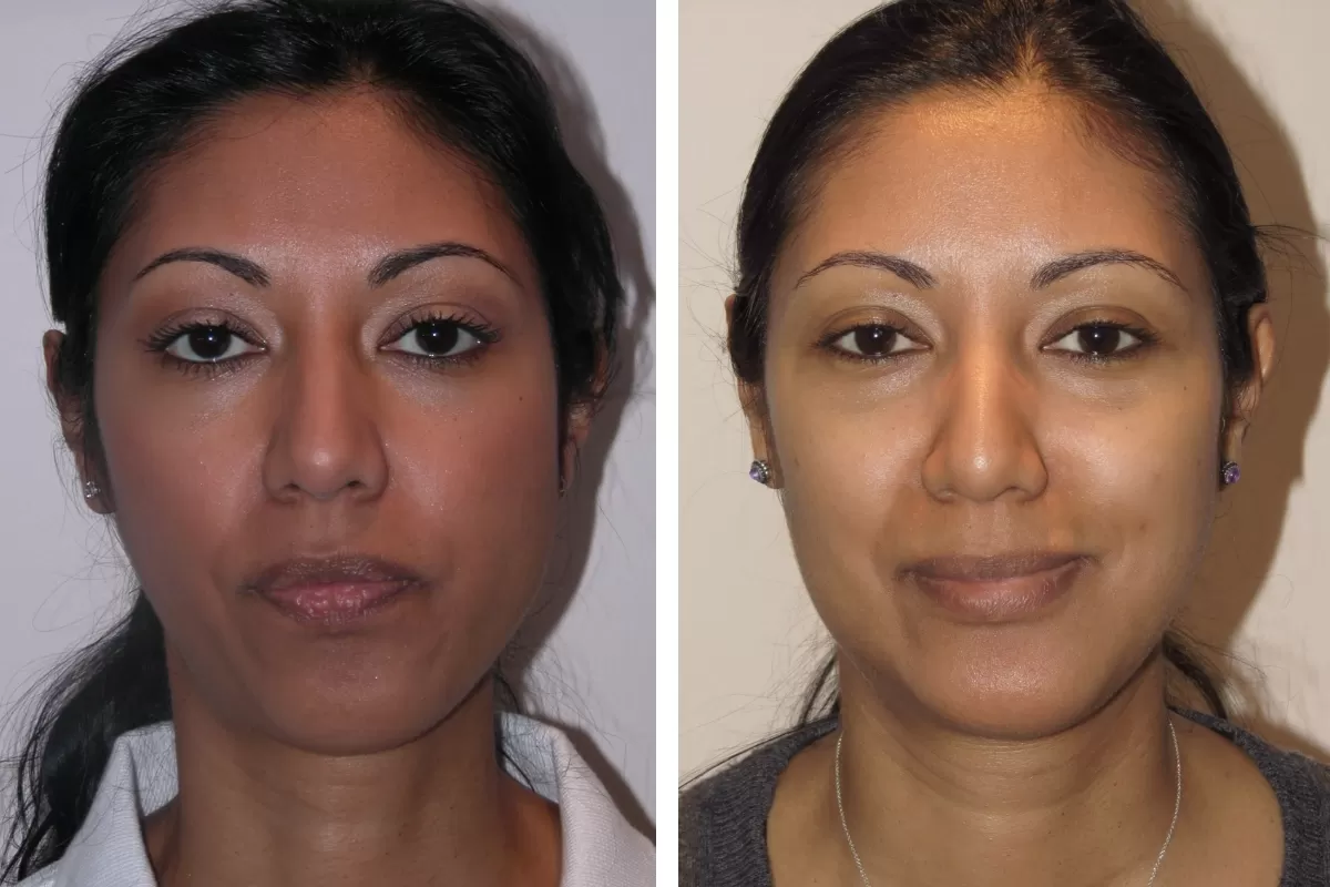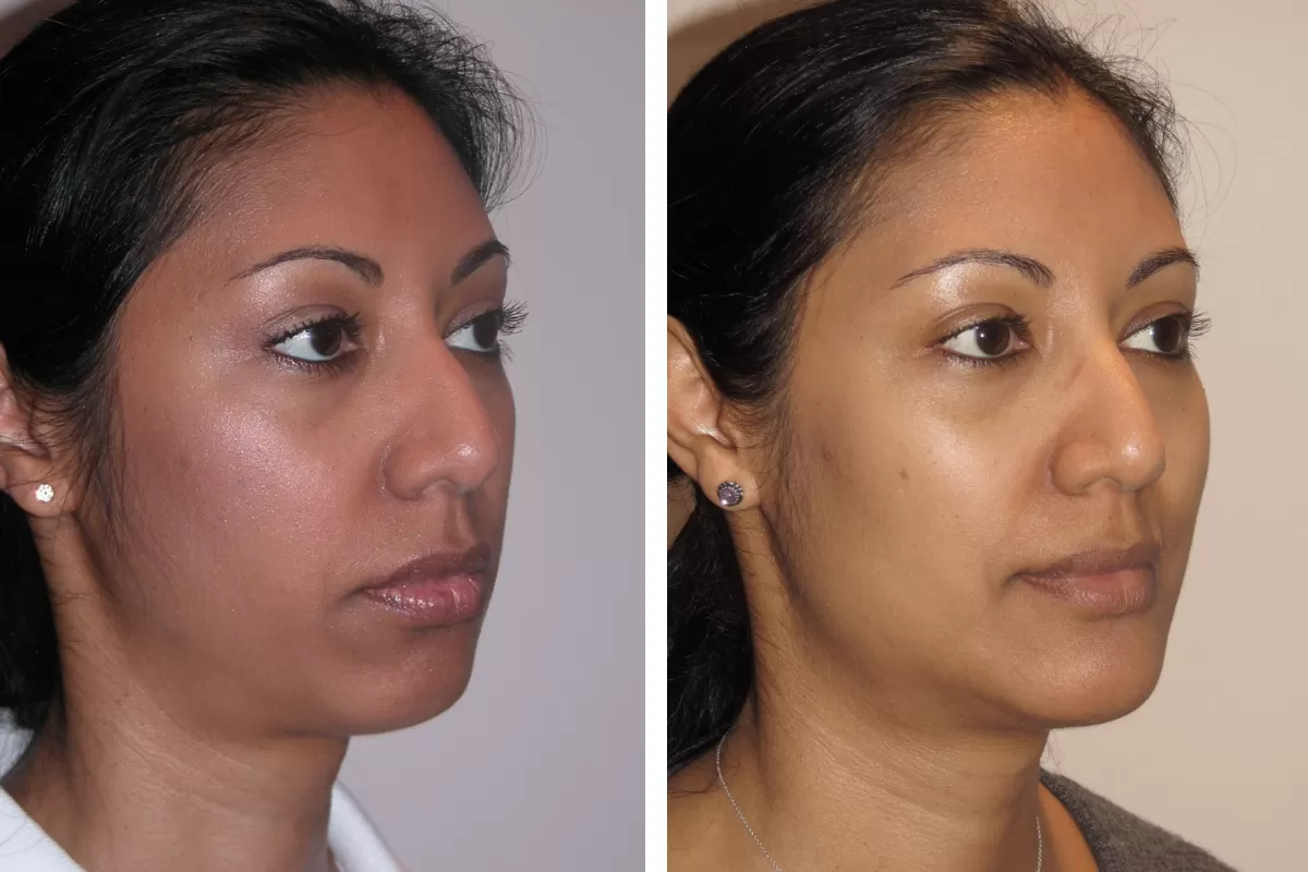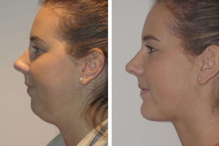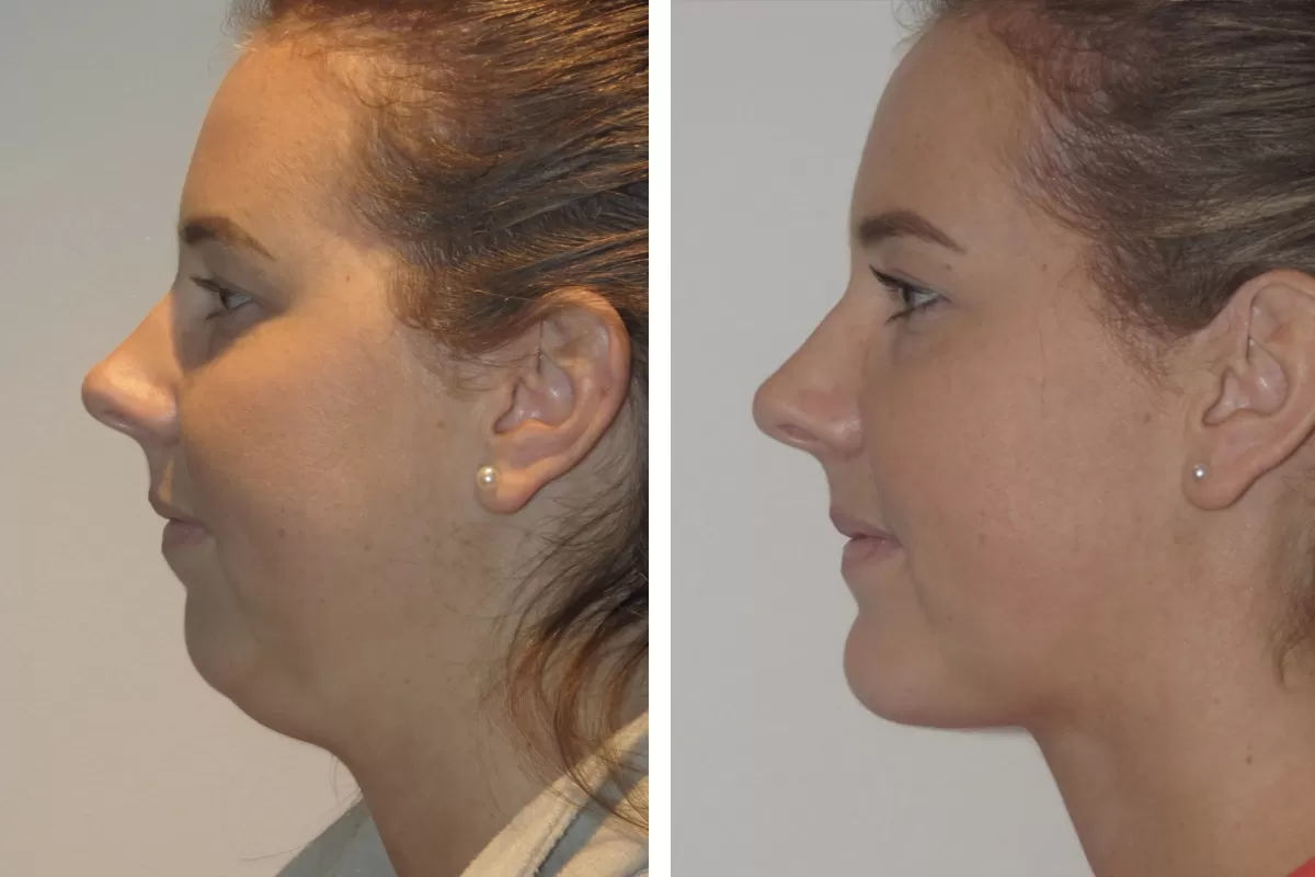 A V-shaped chin is a characteristic feminine feature of the face. It’s when the angle at which the two sides of the jaw converge (at the chin) is more acute and sharp. A broad and wide chin is considered a more masculine feature. Chin trimming contours the chin and makes it V-shaped.